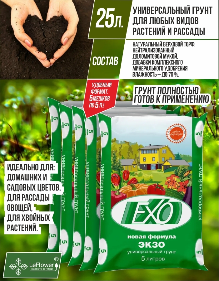 Грунт Экзо Новая Формула - 25л. - (5 упаковок по 5 л.) универсальный высококачественный, натуральный, питательный почвогрунт, готовый к использованию для выращивания рассады, а также комнатных и садовых растений. Используйте универсальную землю Экзо для улучшения почв, мульчирования, создания новых и ремонта старых травяных газонов и вы получите прекрасные результаты. Универсальный грунт повышает всхожесть семян, приживаемость рассады, помогает растениям в быстрой адаптации после пересадки. Подходит для обновления верхнего слоя почвы у больших кадочных растений. Подходит для всех видов садовых растений. Ускоряет рост растений, способствует вызреванию здорового урожая. Универсальная земля Экзо содержит дополнительный запас питательных веществ и микроэлементов, рассчитанных на 6 месяцев. Состав и питательная ценность универсального грунта (мг/л): Натуральный верховой торф, нейтрализованный доломитовой мукой, с добавками комплексного минерального удобрения. Влажность – до 70 %. Для производства земли универсальной применяется натуральный торф. Производство земли для растений реализовано на современном оборудовании с использованием передовых технологий. При производстве Грунт проходит несколько ступеней обработки, включая обеззараживание и тщательное просеивание, за счет чего отсутствуют палки, куски коры и камни.