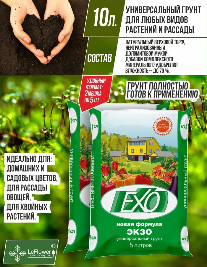 Грунт Экзо Новая Формула - 10л. - (2 упаковки по 5 л.) универсальный высококачественный, натуральный, питательный почвогрунт, готовый к использованию для выращивания рассады, а также комнатных и садовых растений. Используйте универсальную землю Экзо для улучшения почв, мульчирования, создания новых и ремонта старых травяных газонов и вы получите прекрасные результаты. Универсальный грунт повышает всхожесть семян, приживаемость рассады, помогает растениям в быстрой адаптации после пересадки. Подходит для обновления верхнего слоя почвы у больших кадочных растений. Подходит для всех видов садовых растений. Ускоряет рост растений, способствует вызреванию здорового урожая. Универсальная земля Экзо содержит дополнительный запас питательных веществ и микроэлементов, рассчитанных на 6 месяцев. Состав и питательная ценность универсального грунта (мг/л): Натуральный верховой торф, нейтрализованный доломитовой мукой, с добавками комплексного минерального удобрения. Влажность – до 70 %. Для производства земли универсальной применяется натуральный торф. Производство земли для растений реализовано на современном оборудовании с использованием передовых технологий. При производстве Грунт проходит несколько ступеней обработки, включая обеззараживание и тщательное просеивание, за счет чего отсутствуют палки, куски коры и камни.