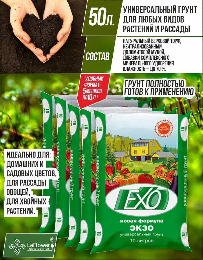 Грунт Экзо Новая Формула -50л. - (5 упаковки по 10 л.) универсальный высококачественный, натуральный, питательный почвогрунт, готовый к использованию для выращивания рассады, а также комнатных и садовых растений. Используйте универсальную землю Экзо для улучшения почв, мульчирования, создания новых и ремонта старых травяных газонов и вы получите прекрасные результаты. Универсальный грунт повышает всхожесть семян, приживаемость рассады, помогает растениям в быстрой адаптации после пересадки. Подходит для обновления верхнего слоя почвы у больших кадочных растений. Подходит для всех видов садовых растений. Ускоряет рост растений, способствует вызреванию здорового урожая. Универсальная земля Экзо содержит дополнительный запас питательных веществ и микроэлементов, рассчитанных на 6 месяцев. Состав и питательная ценность универсального грунта (мг/л): Натуральный верховой торф, нейтрализованный доломитовой мукой, с добавками комплексного минерального удобрения. Влажность – до 70 %. Для производства земли универсальной применяется натуральный торф. Производство земли для растений реализовано на современном оборудовании с использованием передовых технологий. При производстве Грунт проходит несколько ступеней обработки, включая обеззараживание и тщательное просеивание, за счет чего отсутствуют палки, куски коры и камни.