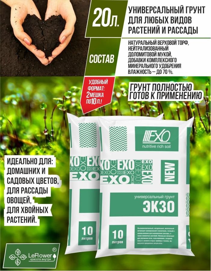 Грунт Экзо - 20л. - (2 упаковки по 10 л.) универсальный высококачественный, натуральный, питательный почвогрунт, готовый к использованию для выращивания рассады, а также комнатных растений. Используйте универсальную землю Экзо для улучшения почв, мульчирования, создания новых и ремонта старых травяных газонов и вы получите прекрасные результаты. Универсальный грунт повышает всхожесть семян, приживаемость рассады. Подходит для всех видов садовых растений. Ускоряет рост растений, способствует вызреванию здорового урожая. Универсальная земля Экзо содержит дополнительный запас питательных веществ и микроэлементов. Состав и питательная ценность универсального грунта (мг/л): Натуральный верховой торф, нейтрализованный доломитовой мукой, с добавками комплексного минерального удобрения. Влажность – до 70 %.Для производства земли универсальной Экзо применяется натуральный торф. Производство земли для растений реализовано на современном оборудовании с использованием передовых технологий. При производстве Грунт проходит несколько ступеней обработки, включая обеззараживание и тщательное просеивание, за счет чего отсутствуют палки, куски коры и камни. Универсальная земля Экзо - всегда прекрасный EXO результат!