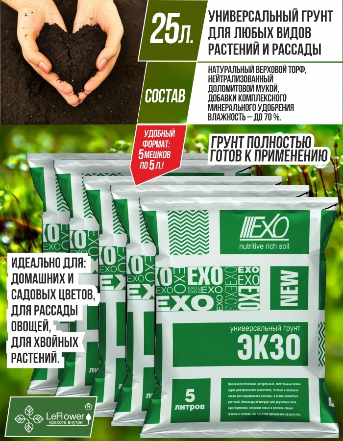 Грунт Экзо - 25л. - (5 упаковок по 5 л.) универсальный высококачественный, натуральный, питательный почвогрунт, готовый к использованию для выращивания рассады, а также комнатных растений. Используйте универсальную землю Экзо для улучшения почв, мульчирования, создания новых и ремонта старых травяных газонов и вы получите прекрасные результаты. Универсальный грунт повышает всхожесть семян, приживаемость рассады. Подходит для всех видов садовых растений. Ускоряет рост растений, способствует вызреванию здорового урожая. Универсальная земля Экзо содержит дополнительный запас питательных веществ и микроэлементов. Состав и питательная ценность универсального грунта (мг/л): Натуральный верховой торф, нейтрализованный доломитовой мукой, с добавками комплексного минерального удобрения. Влажность – до 70 %.Для производства земли универсальной Экзо применяется натуральный торф. Производство земли для растений реализовано на современном оборудовании с использованием передовых технологий. При производстве Грунт проходит несколько ступеней обработки, включая обеззараживание и тщательное просеивание, за счет чего отсутствуют палки, куски коры и камни. Универсальная земля Экзо - всегда прекрасный EXO результат!