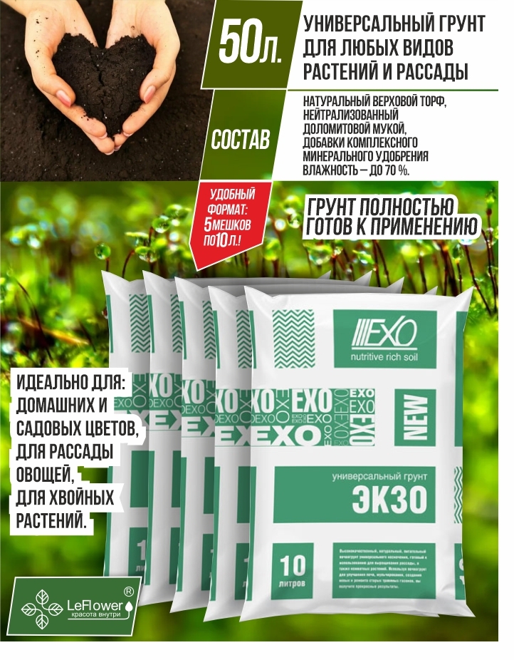 Грунт Экзо - 50л. - (5 упаковок по 10 л.) универсальный высококачественный, натуральный, питательный почвогрунт, готовый к использованию для выращивания рассады, а также комнатных растений. Используйте универсальную землю Экзо для улучшения почв, мульчирования, создания новых и ремонта старых травяных газонов и вы получите прекрасные результаты. Универсальный грунт повышает всхожесть семян, приживаемость рассады. Подходит для всех видов садовых растений. Ускоряет рост растений, способствует вызреванию здорового урожая. Универсальная земля Экзо содержит дополнительный запас питательных веществ и микроэлементов. Состав и питательная ценность универсального грунта (мг/л): Натуральный верховой торф, нейтрализованный доломитовой мукой, с добавками комплексного минерального удобрения. Влажность – до 70 %.Для производства земли универсальной Экзо применяется натуральный торф. Производство земли для растений реализовано на современном оборудовании с использованием передовых технологий. При производстве Грунт проходит несколько ступеней обработки, включая обеззараживание и тщательное просеивание, за счет чего отсутствуют палки, куски коры и камни. Универсальная земля Экзо - всегда прекрасный EXO результат!