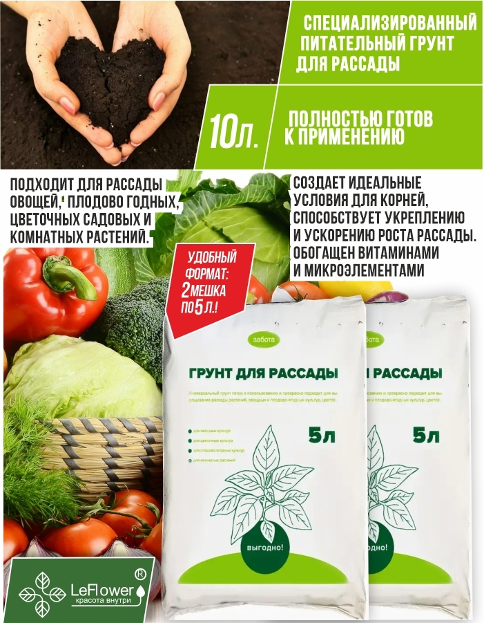 Грунт универсальный "Забота рассада" 10л. - (2 упаковки по 5 л.) Этот высококачественный грунт обеспечит ваши растения всеми необходимыми питательными веществами, поддерживая их здоровый рост и развитие. Благодаря оптимальной влагоемкости и воздухопроницаемости, он создает идеальные условия для корневой системы, способствуя укреплению и ускорению роста вашей рассады. Выбирайте наш продукт – ваш надежный помощник для получения богатого урожая!