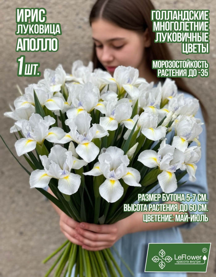 Ирис Аполло — является мелколуковичным сортом. Цветы белоснежного цвета украшены ярким желтым язычком, который придает им праздничности. На каждом цветоносе вырастает по одному цветку. Раскрытые бутоны пышные, нежные, вместе с тем аккуратно сформированные и плотные, в диаметре достигают 5-7 см. Высота растения обычно составляет 40-60 см. Листья плотно прилегают к стеблю, формируя вид косички. Пленительный аромат распространяется по территории всего садового участка. Голландские ирисы будут хорошо выглядеть в саду и в контейнерах, а еще лучше в вазе. Из этих растений получаются прекрасные букеты и флористические композиции. В каждую упаковку вложена инструкция по высадке и уходу. Указанное изображение является справочным и информационным-описательным для сортов. Итоговое цветение может отличаться в зависимости от региона высадки, особенностей почвы, светового режима и ухода за растением в процессе роста, а также от возраста растения.