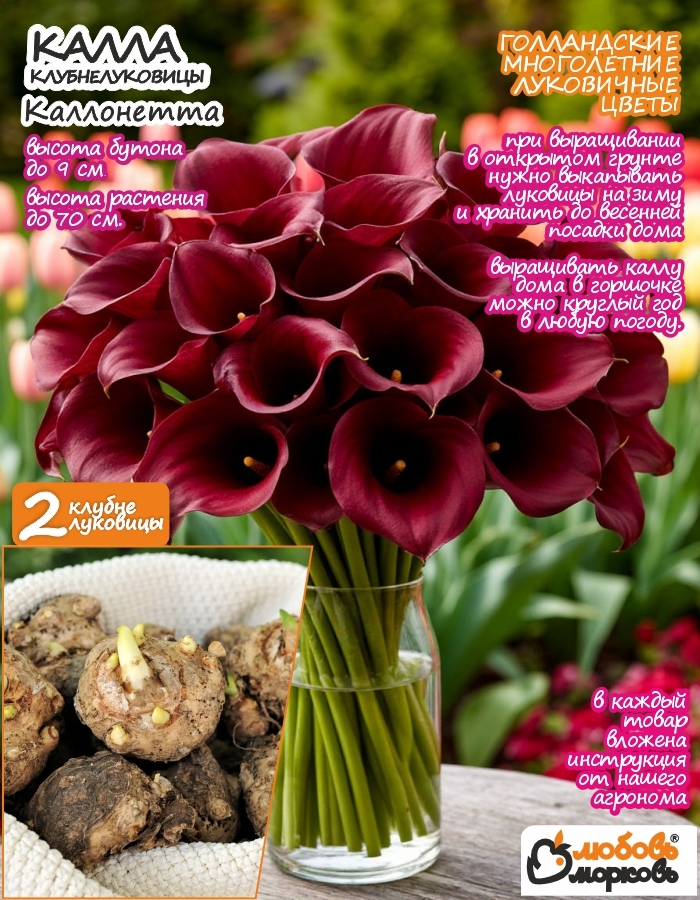 Калла  Каллонетта (Zantedeschia Callonetta)- это растение, которое обладает невероятной красотой и уникальным внешним видом. Его цветы имеют темно-пурпурный оттенок, который делает их особенно привлекательными. Диаметр цветка составляет от 9,5 до 10 см, а длина или высота цветка – от 6,5 до 7 см. Помимо основного темно-пурпурного цвета, у цветков "Callonetta" есть еще и другой, вторичный цвет – черный. Это придает цветам еще больше глубины и загадочности, делая их по-настоящему уникальными.