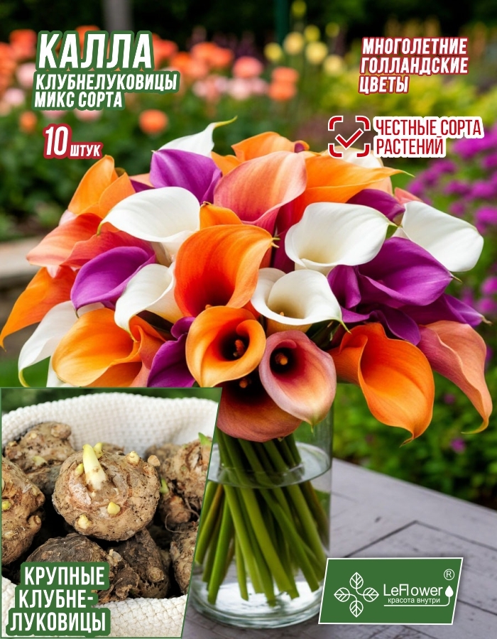 Каллы микс разных сортов. Возможные сорта в наборе: Сиберия, Хавк Ай, Голд кап, Каллонетта. Калла от лучшего Голландского производителя. Прекрасно растет дома в горшочке круглый год, а также в открытом грунте (посадка весной, не переносит морозы в открытом грунте - лучше пересадить в горшок дома). Многолетнее травянистое растение семейства ароидные. Калла - поистине уникальный и элегантный цветок. Их форма не похожа ни на какие другие, и они доступны в огромном ассортименте цветов и длины стебля. Каллы выращивают из луковичных корней, называемых клубнями. Калла может стать прекрасным украшением для любого сада. Его экзотический вид и красивые цветы привлекут любителей растений и станут настоящим украшением для любого ландшафта. Если вы хотите добавить нечто особенное в свой сад или просто насладиться красотой экзотических растений, калла станет отличным выбором. Его неповторимый внешний вид и яркие цветы непременно поразят всех ваших гостей и подарят вам незабываемые эмоции. Перед посадкой купленных клубней их выдерживают в растворе марганца светло-розового цвета в течение часа. Это предотвращает развитие возбудителей заболеваний, которые могут быть в невидимых остатках прежнего грунта после посадки. А затем луковицу высаживают в подготовленный горшок на глубину около дециметра, сверху почву требуется укрыть пленкой или банкой. Выращивание калл проводится в пределах температуры от 15 до 24 градусов. В летний сезон хорошо растение будет себя чувствовать на улице или балконе. Итоговое цветение может незначительно отличаться в зависимости от региона высадки, особенностей почвы, светового режима и ухода за растением в процессе роста.