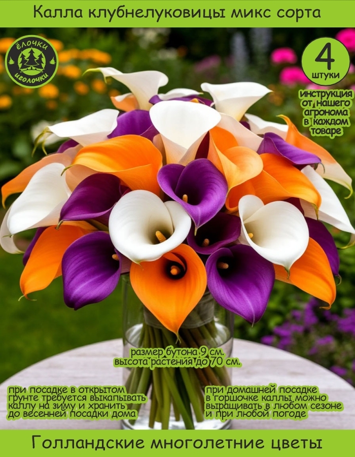 Каллы микс разных сортов. Калла от лучшего Голландского производителя. Прекрасно растет дома в горшочке круглый год, а также в открытом грунте (посадка весной, не переносит морозы в открытом грунте - лучше пересадить в горшок дома). Многолетнее травянистое растение семейства ароидные. Калла - поистине уникальный и элегантный цветок. Их форма не похожа ни на какие другие, и они доступны в огромном ассортименте цветов и длины стебля. Каллы выращивают из луковичных корней, называемых клубнями. Калла может стать прекрасным украшением для любого сада. Его экзотический вид и красивые цветы привлекут любителей растений и станут настоящим украшением для любого ландшафта. Если вы хотите добавить нечто особенное в свой сад или просто насладиться красотой экзотических растений, калла станет отличным выбором. Его неповторимый внешний вид и яркие цветы непременно поразят всех ваших гостей и подарят вам незабываемые эмоции. Перед посадкой купленных клубней их выдерживают в растворе марганца светло-розового цвета в течение часа. Это предотвращает развитие возбудителей заболеваний, которые могут быть в невидимых остатках прежнего грунта после посадки. А затем луковицу высаживают в подготовленный горшок на глубину около дециметра, сверху почву требуется укрыть пленкой или банкой. Выращивание калл проводится в пределах температуры от 15 до 24 градусов.В летний сезон хорошо растение будет себя чувствовать на улице или балконе. Итоговое цветение может незначительно отличаться в зависимости от региона высадки, особенностей почвы, светового режима и ухода за растением в процессе роста.