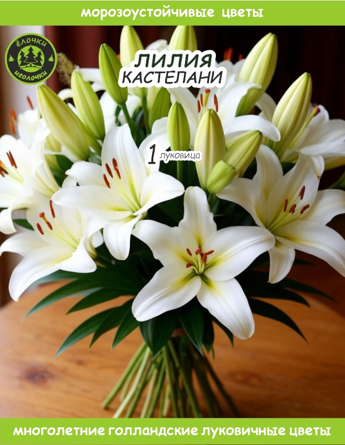 Лилия "Castellani" (Кастелани)-Белая красавица лилия Castellani относится к восточной группе. Сорт имеет крупные белые цветки диаметром до 25 см, с сильным ярким ароматом. Подойдет для выращивания под срез и в открытом грунте. Посадка рекомендуется в начале апреля, луковицы сажаются в достаточно рыхлую плодородную слабокислую почву без застоя воды. В период роста можно вносить подкормки и проводить дополнительные поливы. Период цветения - начало августа