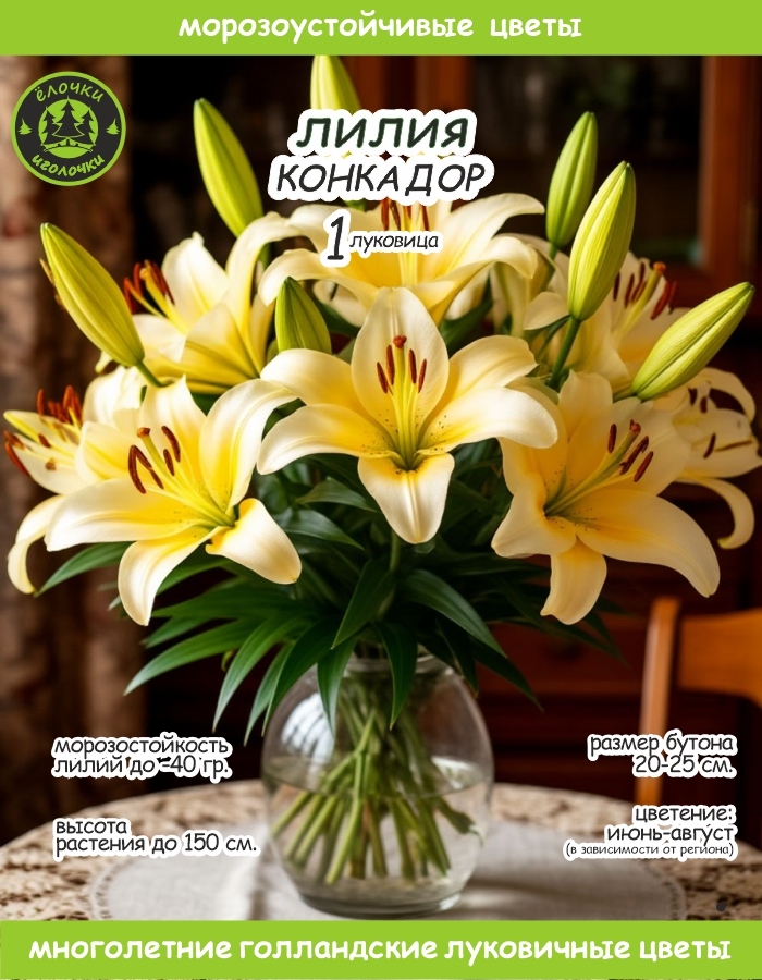 Лилия (Conca D'or) Конка Д'Ор относится к ОТ-гибридам. Высота растения до 150. Цветок крупный. Окрас цветка: цветки с приятным, не резким, пряным ароматом. Цветки светло-желтого цвета с кремово-белыми краями, слегка загнутыми, смотрят в сторону и чуть вниз. Цветки широко-чашевидные. , диаметр цветка до 25 см. Луковицы лилий приходят в пакете с грунтом. Подробная инструкция по уходу за растением вложена в каждый товар.