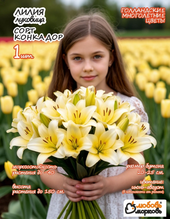 Лилия (Conca D'or) Конка Д'Ор относится к ОТ-гибридам. Высота растения до 150. Цветок крупный. Окрас цветка: цветки с приятным, не резким, пряным ароматом. Цветки светло-желтого цвета с кремово-белыми краями, слегка загнутыми, смотрят в сторону и чуть вниз. Цветки широко-чашевидные. , диаметр цветка до 25 см. Луковицы лилий приходят в пакете с грунтом. Подробная инструкция по уходу за растением вложена в каждый товар.