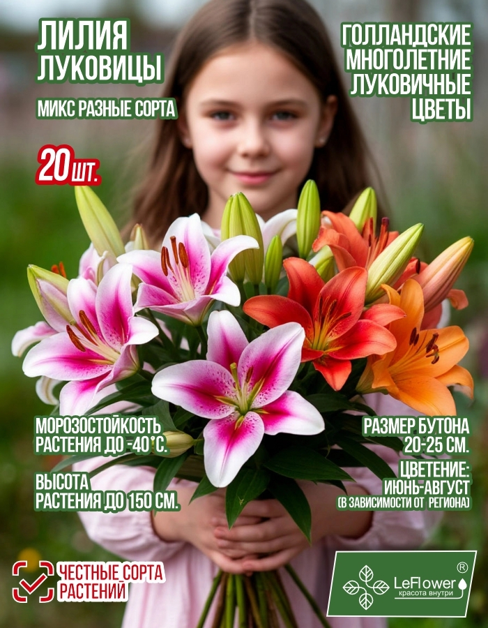 Лилия 20 луковиц для посадки в упаковке. Представляем вашему вниманию великолепные лилии от Leflower! Эти голландские красавицы станут жемчужиной любого сада. Упаковка содержит 20 крепких луковиц, готовых радовать вас своими крупными бутонами диаметром 25 см каждый. Одновременно распускается около 6 ароматных цветков на одном стебле, которые будут гордо стоять среди других растений благодаря своей устойчивости к капризам погоды. Июль и август - время, когда эти цветы покажут всю свою мощь и величие. Их можно использовать как для декорации участка, так и для составления шикарных букетов. Подходит для начинающих садоводов - подробная инструкция по высадке прилагается. Спешите купить и создать свой райский уголок уже сегодня!