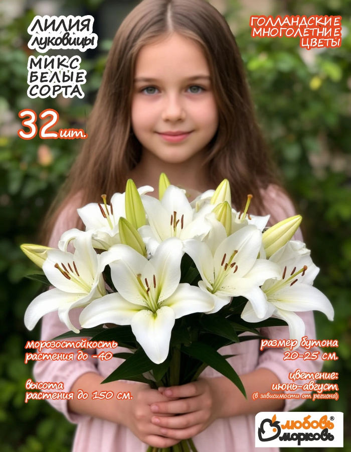 Лилия микс белых сортов (в составе сорта Замбези, Сайберия, Сантандер, Тисенто, Саронно, Северн). Они созданы для декоративного озеленения, подойдут для срезки и одиночно-групповых посадок. Эти сорта ослепительно-белого цвета, с длинными стеблями, изумрудной зеленью, длительным цветением и неприхотливостью в выращивании.