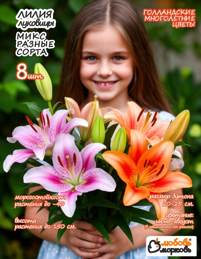 Лилия 8шт микс слотов в упаковке. Это ОТ-гибрид (усложнённый гибридный сорт). Лилия для декоративного озеленения, подойдёт для срезки и одиночно-групповых посадок. На каждом из цветоносных стеблей в среднем по 6 цветков. Бутон довольно крупный - в диаметре 25 см. Обладает неприхотливостью к условиям выращивания и устойчивостью к капризам погоды. Семена предназначены для посадки в цветники и клумбы. Разбор луковиц от 14 до 18.Период цветения: июль-август. Подробная инструкция по высадке и уходу за растением вложена в упаковку. Итоговое цветение может отличаться от указанного на изображении и зависит от климата, почвы, условий выращивания и других факторов.