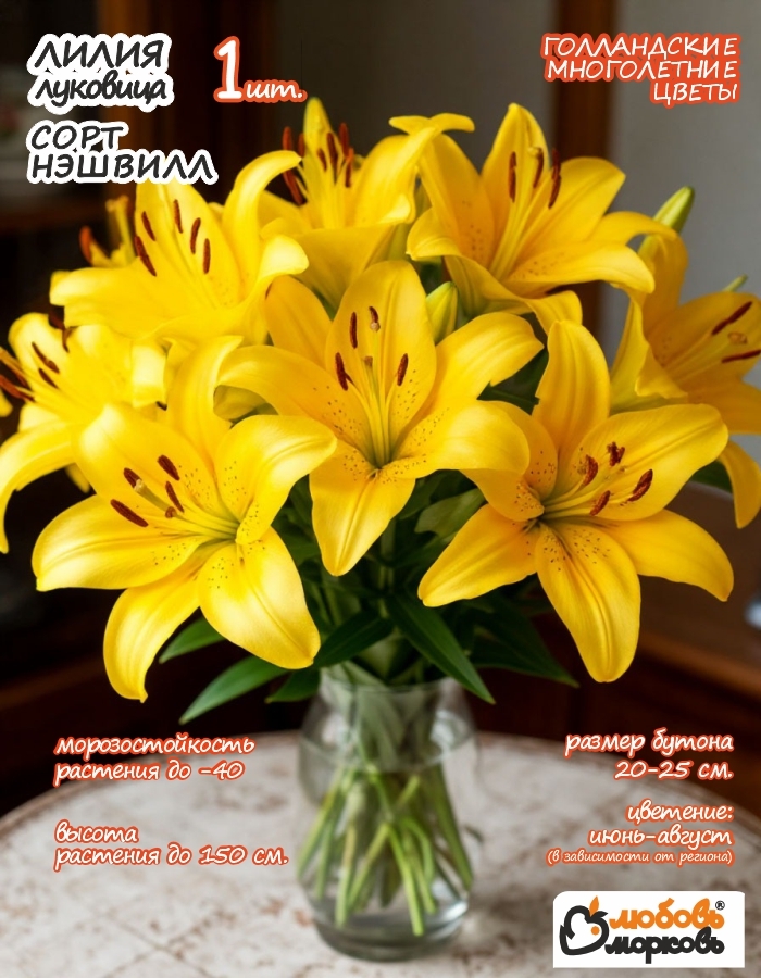 Невероятное украшение вашего сада! Лилия Nashville от бренда "Любовь Морковь" подарит вам буйство красок и ароматов благодаря ярким золотистым цветкам с крупными рыжеватыми тычинками. Продукт поставляется из Нидерландов с почвой и инструкцией по посадке – ваш идеальный подарок жене, подруге или просто для украшения участка. Покупайте луковицы лилия нэшвилл сейчас и создайте великолепный ландшафт уже этой весной!