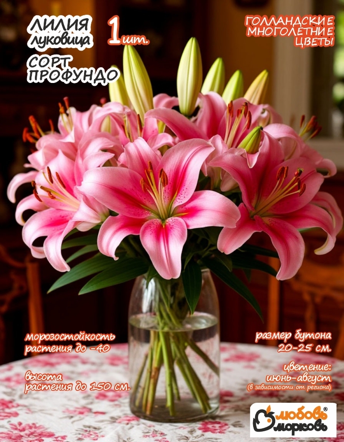 Луковички "Любовь Морковь" из Нидерландов подарят вашему саду роскошные цветы уже весной! Lilia Profundo — идеальный выбор для тех, кто ценит красоту, аромат и простоту ухода. Присадка всего трех луковиц обеспечит вам обильное цветение, которое станет центром внимания вашего участка. Подарите себе, жене или любимой этот кусочек природы, воплощённый в изысканных цветах, способных украсить любой пейзаж. Подчеркните свою любовь заботой о прекрасном с сортом, устойчивым к капризам погоды и болезням.