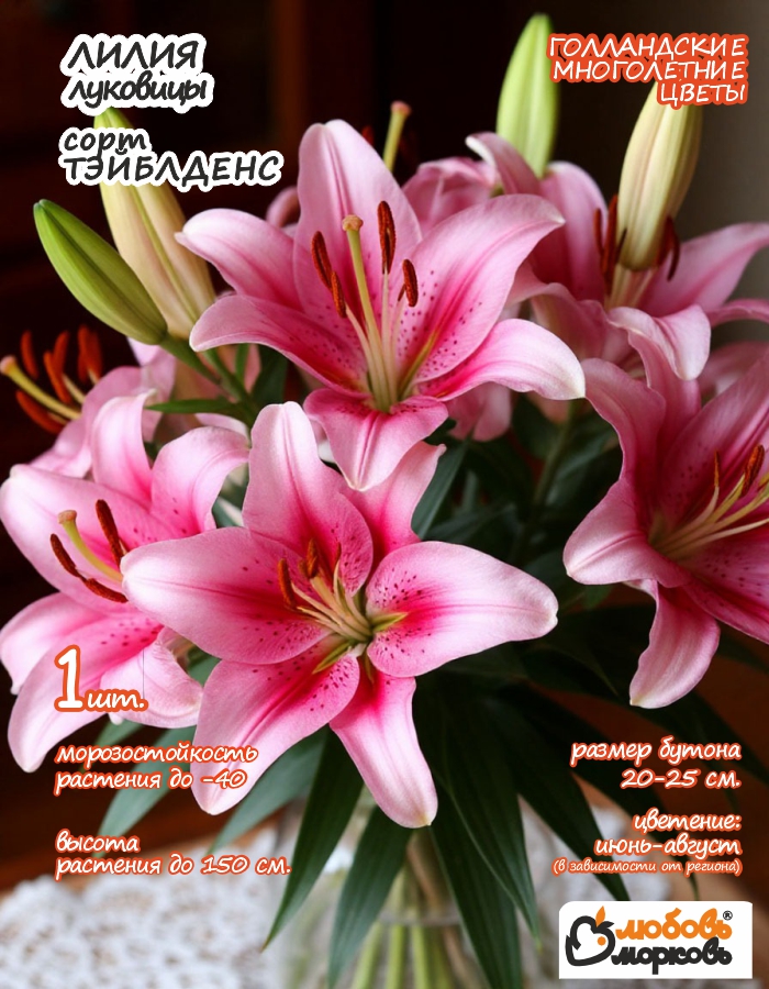Лилия 1 шт. в упаковке. Это ОТ-гибрид (усложнённый гибридный сорт). Лилия для декоративного озеленения, подойдёт для срезки и одиночно-групповых посадок. На каждом из цветоносных стеблей в среднем по 6 цветков. Бутон довольно крупный - в диаметре 25 см. Обладает неприхотливостью к условиям выращивания и устойчивостью к капризам погоды. Семена предназначены для посадки в цветники и клумбы. Разбор луковиц от 14 до 18. Цветения: июль-август.