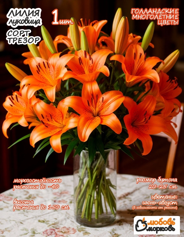 Луковицы лилий приходят в пакете с грунтом. Подробная инструкция по уходу за растением вложена в каждый товар. Подарите ей красоту и аромат цветущего сада! Липстик оранжевых бутонов придаст элегантность вашему участку и станет ярким акцентом в ландшафте. Нежные лепестки, насыщенные цветом, создадут атмосферу тепла и уюта. Покупайте луковицы Lilium Tresor от бренда "Любовь любовь" из Нидерландов – гарантированное качество. Удобно упакованы со специальным грунтом, готовы к посадке сразу после покупки!