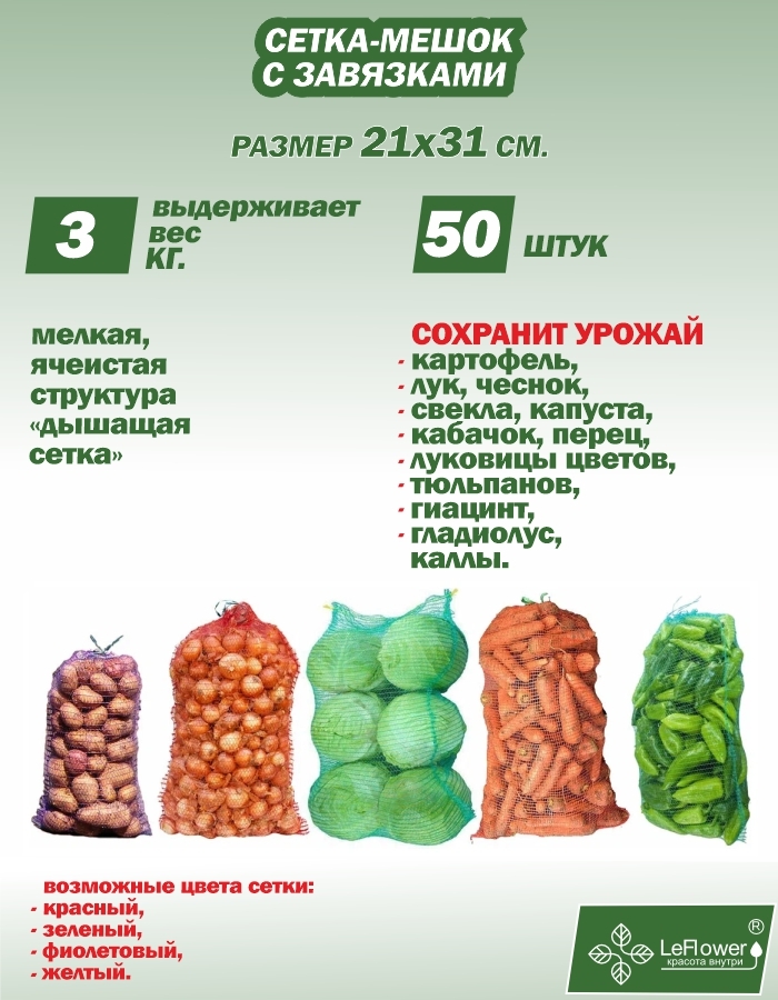 Сетка-мешок с завязками для ручной фасовки. Надежное и прочное решение для хранения и транспортировки ваших овощей и луковиц. Мешки можно использовать также в качестве упаковки для фруктов — слив, яблок, апельсинов, абрикосов, груш и многих других. Продукт в сетке можно разглядеть, что повышает его потребительскую ценность. Достоинства: нетоксичный материал который не портит продукты. Мусор, высохшая земля и грязь не задерживаются внутри упаковки. Тара дышит, поэтому овощи не слеживаются и не гниют. Мешки не впитывают гниль, поэтому испорченные овощи не влияют на их качество. Сетка практически не имеет веса, можно взвешивать товар прямо в ней, легко затягивается с помощью завязки, что не дает овощам просыпаться. Её можно мочить и использовать вторично. Идеальное решение для садоводов, фермеров и всех, кто заботится о своих урожаях! Универсальная сетка (21х31 см) имеет вместимость до 3 кг. Набор состоит из 50 штук. ((Сетка - мешок для хранения: картошки, картофеля, лук, чеснок, свекла капуста, кабачок, луковицы цветов, тюльпанов, гиацинт, гладиолус, калл.)