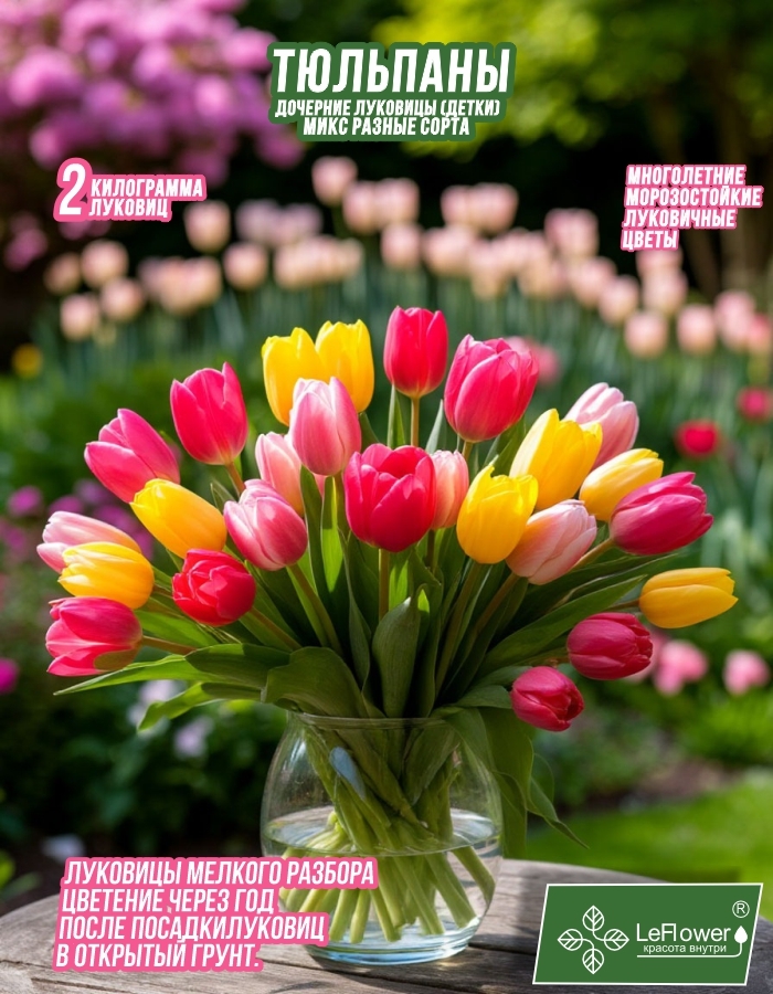 Тюльпан дочерние луковицы, 2000 грамм микс сортов. Тюльпан это травянистый многолетник с луковицами. За время эволюции он приспособился к жизни в горах, на степных просторах и в пустынной местности. Его ценят за привлекательную внешность и неприхотливый характер. Спокойно переносит морозную зиму, жаркое и сухое лето, дождливую и короткую весну. Развитие от семени до цветущего куста может длиться от 3 до 7 лет. Вырастает от 10 до 95 см (в зависимости от разновидности). Луковицы тюльпанов должны пройти все стадии созревания цветоноса последовательно в открытом грунте. Урожай этого года, что означает - цветение весной следующего года. Подробная инструкция по уходу за растением вложена в каждый товар. Указанное изображение является справочным и информационным-описательным для сортов цветка. Итоговое цветение может незначительно отличаться в зависимости от региона высадки, особенностей почвы, светового режима и ухода за растением в процессе роста.