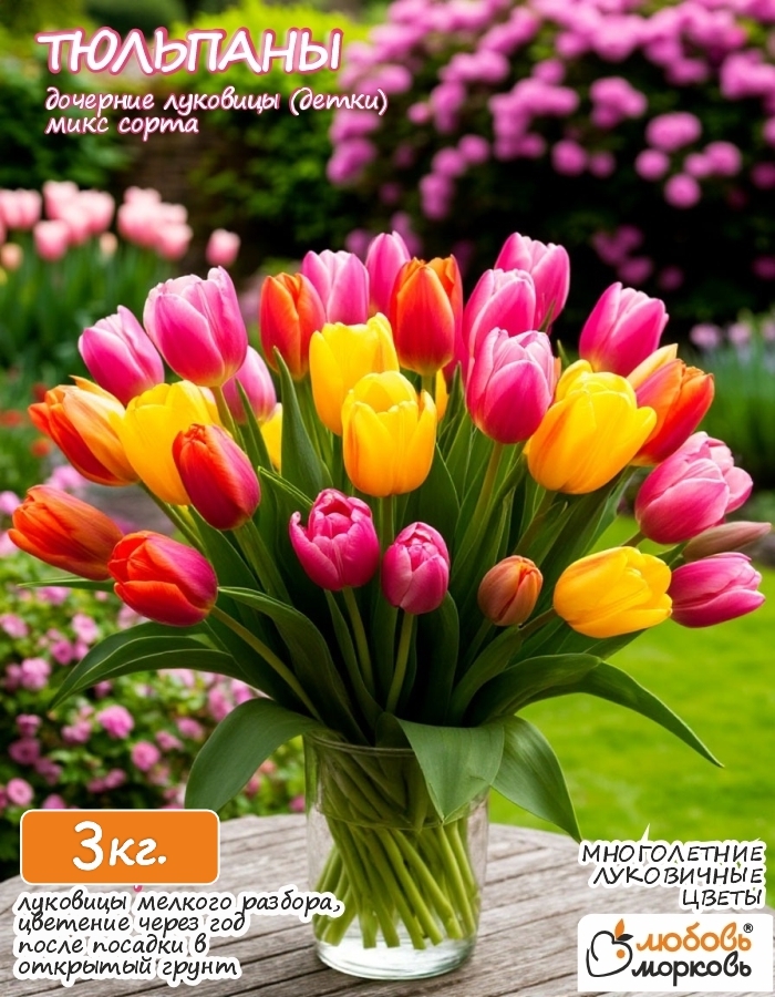 Тюльпан дочерние луковицы, 3кг грамм микс сортов. Тюльпан это травянистый многолетник с луковицами. За время эволюции он приспособился к жизни в горах, на степных просторах и в пустынной местности. Его ценят за привлекательную внешность и неприхотливый характер. Спокойно переносит морозную зиму, жаркое и сухое лето, дождливую и короткую весну. Развитие от семени до цветущего куста может длиться от 3 до 7 лет. Вырастает от 10 до 95 см (в зависимости от разновидности). Луковицы тюльпанов должны пройти все стадии созревания цветоноса последовательно в открытом грунте. Урожай этого года, что означает - цветение весной следующего года. Подробная инструкция по уходу за растением вложена в каждый товар. Указанное изображение является справочным и информационным-описательным для сортов цветка. Итоговое цветение может незначительно отличаться в зависимости от региона высадки, особенностей почвы, светового режима и ухода за растением в процессе роста.