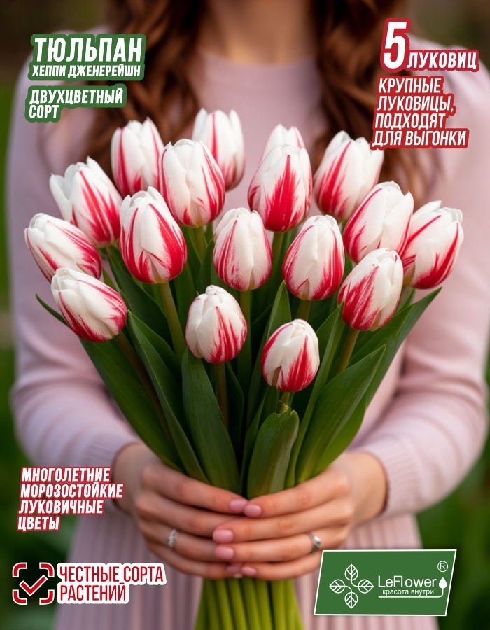 Тюльпан Хэппи Дженерейшн – луковицы крупные для выгонки или озеленения в открытом грунте. Урожай 2025 года. Хэппи Дженерейшн относятся к классу 3 – Триумф. Растение имеет прочный прямостоячий стебель, высотой оно от 40 до 60 см. Листья плотные, матовые и широколанцетные, светло-зеленого цвета. Цветки крупные, с насыщенно-красными полосами. Форма цветка бокаловидная, диаметр составляет от 5 до 7 см, а высота – от 10 до 12 см. Лепестки гладкие и маслянистые. Аромат нежный. Тюльпаны относятся к раннецветущим. Период цветения начинается в апреле и продолжается до мая.