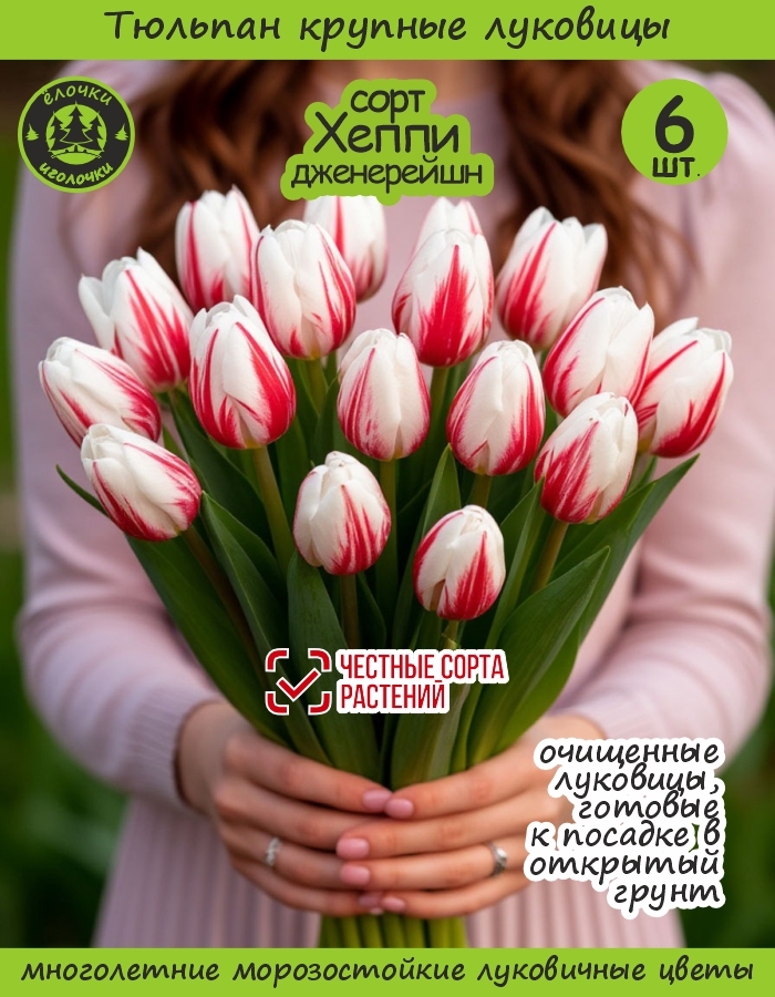 Тюльпан Хэппи Дженерейшн – луковицы крупные для выгонки или озеленения в открытом грунте. Урожай 2025 года. Луковицы неочищенные, необходимо аккуратно очистить от внешней шелухи перед посадкой. При очистке отделить деток тюльпанов, по итогу получается гораздо больше луковиц чем заявлено. Хэппи Дженерейшн относятся к классу 3 – Триумф. Растение имеет прочный прямостоячий стебель, высотой оно от 40 до 60 см. Листья плотные, матовые и широколанцетные, светло-зеленого цвета. Цветки крупные, белоснежные с насыщенно-красными полосами. Форма цветка бокаловидная, диаметр составляет от 5 до 7 см, а высота – от 10 до 12 см. Лепестки гладкие и маслянистые. Аромат нежный. Тюльпаны относятся к раннецветущим. Период цветения начинается в апреле и продолжается до мая.