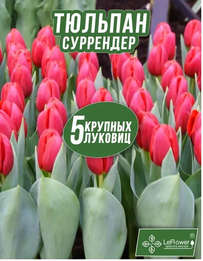 Суррендер, являются одним из самых популярных сортов. Этот сорт был выведен в Нидерландах и относится к классу 3. Триумф. Прежде всего можно отметить яркую окраску цветков, крупный размер, бокаловидную форму и долгое время сохранения свежести после срезки. Однако эти тюльпаны не очень высокие – обычно они достигают высоты 45-60 см. Это раннецветущие тюльпаны – период цветения начинается уже в конце апреля и продолжается до мая. Цветки имеют насыщенную ярко-красную окраску и диаметр от 5 до 10 см. Высота цветка составляет 7-8 см.