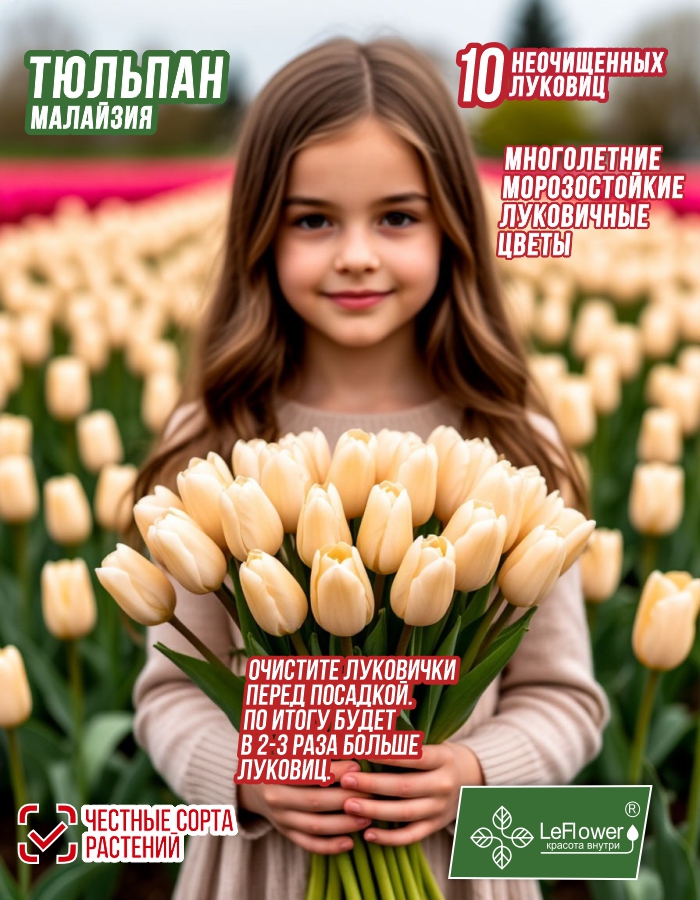 Тюльпан Малайзия, 10 луковиц в упаковке, Голландия. Сорт отличается нежным кремовым цветом и крупным бутоном. Высота бокала - 9 см, диаметр - 7 см. Луковицы тюльпанов для озеленения, должны пройти все стадии созревания цветоноса последовательно в открытом грунте. Урожай этого года, что означает - цветение весной следующего года. Подробная инструкция по высадке и уходу приложена к каждому товару. Итоговое цветение может незначительно отличаться.